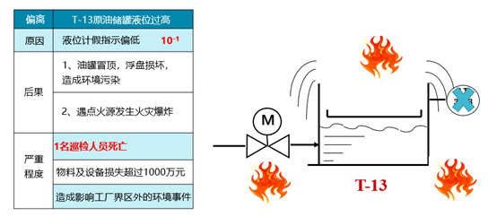 如果企業(yè)的報警管理不善,出現(xiàn)頻繁報警、誤報警、報警響應(yīng)率低,導(dǎo)致報警及人員響應(yīng)這個保護層失效,那么事故發(fā)生的頻率將由10-5/年降至10-4/年,若企業(yè)BPCS自控率低、未設(shè)置必要聯(lián)鎖或聯(lián)鎖解除不規(guī)范,那么發(fā)生事故的概率將進一步提高。 單件事故發(fā)生概率 1×10-4 1×10-3 1×10-2 10年內(nèi)發(fā)生人員死亡事故的概率 9.5% 63.2% 95%(3年發(fā)生人員死亡事故概率) 如果缺少必要的保護層,單個嚴重事故的概率即使為10-3/年,在事件數(shù)量增加(100個劇情)和時間跨度增加(10年)后,將有接近三分之二的概率發(fā)生人員死亡事故!若單個嚴重事故的概率降到10-2/年,3年內(nèi)發(fā)生人員死亡的概率高達95%!