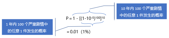 在HAZOP分析的過程中,每條劇情都應(yīng)盡可能的將風(fēng)險降到低風(fēng)險區(qū)域(可接受區(qū))。那么 ? 假設(shè)A公司經(jīng)HAZOP分析,共分析得到各類風(fēng)險場景3000條,其中嚴重后果(人員死亡)場景100條。 ? 每條嚴重后果的場景經(jīng)各類安全措施保護,風(fēng)險均降到10-5/年,達到可接受風(fēng)險要求。 ? 10年中A公司出現(xiàn)人員死亡事故的概率是多少? 計算答案是10年中A公司出現(xiàn)人員死亡事故的概率是1%