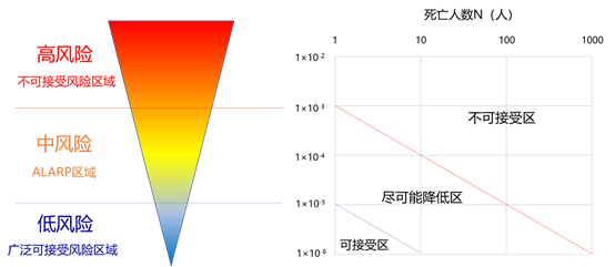 我國社會可接受風(fēng)險標準圖中界定,低密度場所1人死亡概率在10-5/年以下為可容忍區(qū)域。