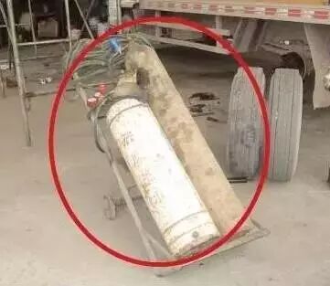 氣瓶隱患圖2 ▲乙炔減壓器未安裝回火防止器,氣瓶未采取防傾倒措施,顏色不符合標(biāo)準(zhǔn)要求的白色,可能造成火災(zāi)、容器爆炸事故。 氣瓶隱患圖3 ▲氧氣、乙炔膠管使用同一種顏色膠管,未區(qū)分,存放狀態(tài)下兩瓶之間安全距離不足。可造成火災(zāi)、容器爆炸事故。 氣瓶隱患圖4 ▲氧氣瓶和液壓罐使用狀態(tài)下距離不足5米,氧氣減壓器壓力表?yè)p壞失效,膠管未區(qū)分,使用同一種顏色膠管,可能造成火災(zāi)、容器爆炸事故。 氣瓶隱患圖5 ▲氧氣瓶使用的膠管錯(cuò)誤,氧氣應(yīng)采用藍(lán)色膠管。氧氣瓶與乙炔氣瓶距離不足5米,乙炔瓶離產(chǎn)生火花的設(shè)備砂輪切割機(jī)太近,可能造成容器爆炸事故。 氣瓶隱患圖6 ▲氧氣瓶、液化罐混裝叉車運(yùn)輸,氧氣瓶?jī)扇σ幻比笔В赡茉斐扇萜鞅ㄊ鹿省?/span> 氣瓶隱患圖7 ▲CO2氣瓶頸破裂,鋼印模糊不清,懷疑使用殘廢瓶,可能造成容器爆炸事故。 氣瓶隱患圖8 ▲乙炔瓶未保持直立儲(chǔ)存,在太陽(yáng)下暴曬。可能造成火災(zāi)、容器爆炸事故。 氣瓶隱患圖9 ▲氧氣減壓器壓力表未校驗(yàn),氧氣膠管膠皮剝落,膠管扎頭未采用標(biāo)準(zhǔn)管夾,可能造成火災(zāi)、容器爆炸事故。 氣瓶隱患圖10 ▲氧氣減壓器失效破裂,可能造成氧氣膠管爆裂,發(fā)生火災(zāi)事故。 氣瓶隱患圖11 ▲氣瓶在吊車作業(yè)范圍內(nèi),無防護(hù)圈,無防倒設(shè)置。 氣瓶隱患圖12 氣瓶隱患圖13 氣瓶隱患圖14 ▲氣線應(yīng)為紅色,施工現(xiàn)場(chǎng)同類氣瓶數(shù)量不得超過5支,無防護(hù)圈,無防倒設(shè)置,安全附件不全。 氣瓶隱患圖15 氣瓶隱患圖16 ▲氣瓶無防護(hù)圈,瓶間距應(yīng)小于5米,無防倒設(shè)置,氣線顏色混亂。 氣瓶隱患圖17 ▲氣瓶無防護(hù)圈,無防倒設(shè)置,瓶體顏色缺失,同一種氣瓶管線顏色不同。 氣瓶隱患圖18
